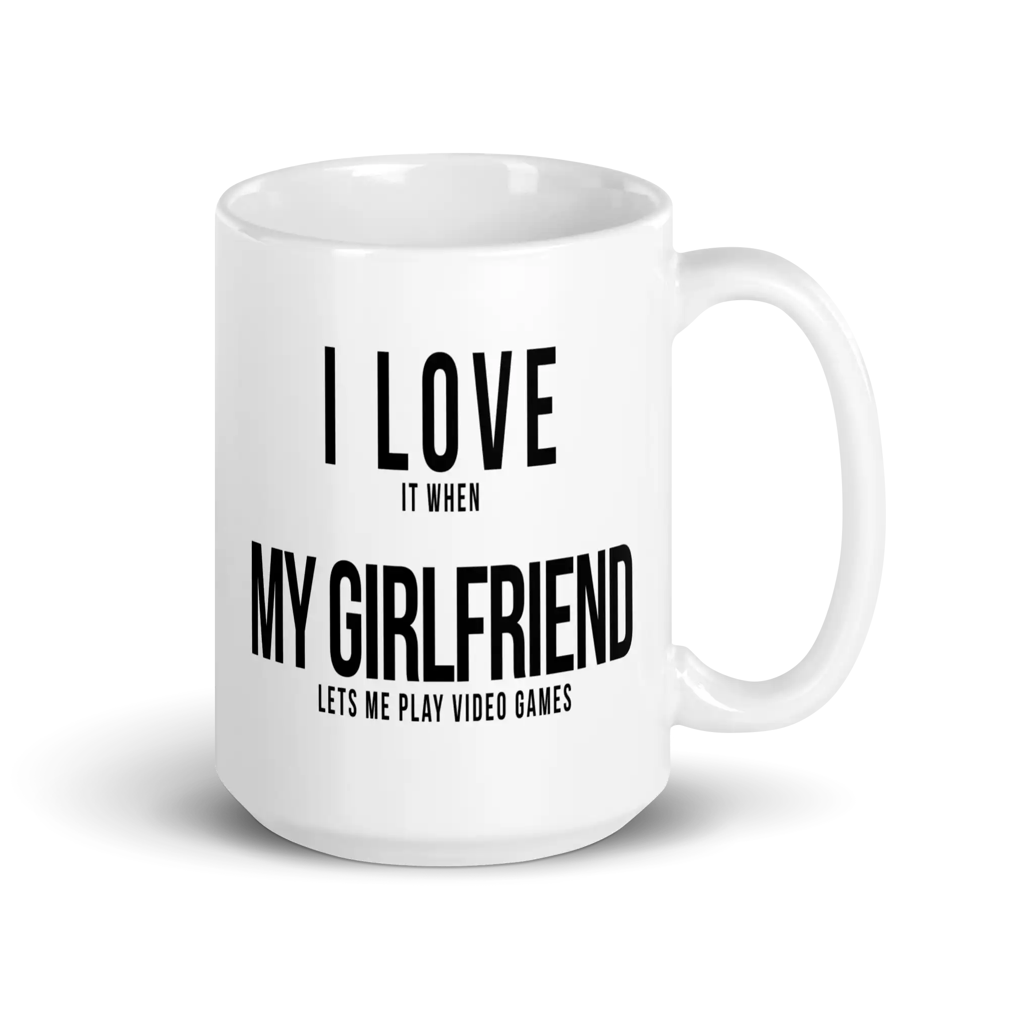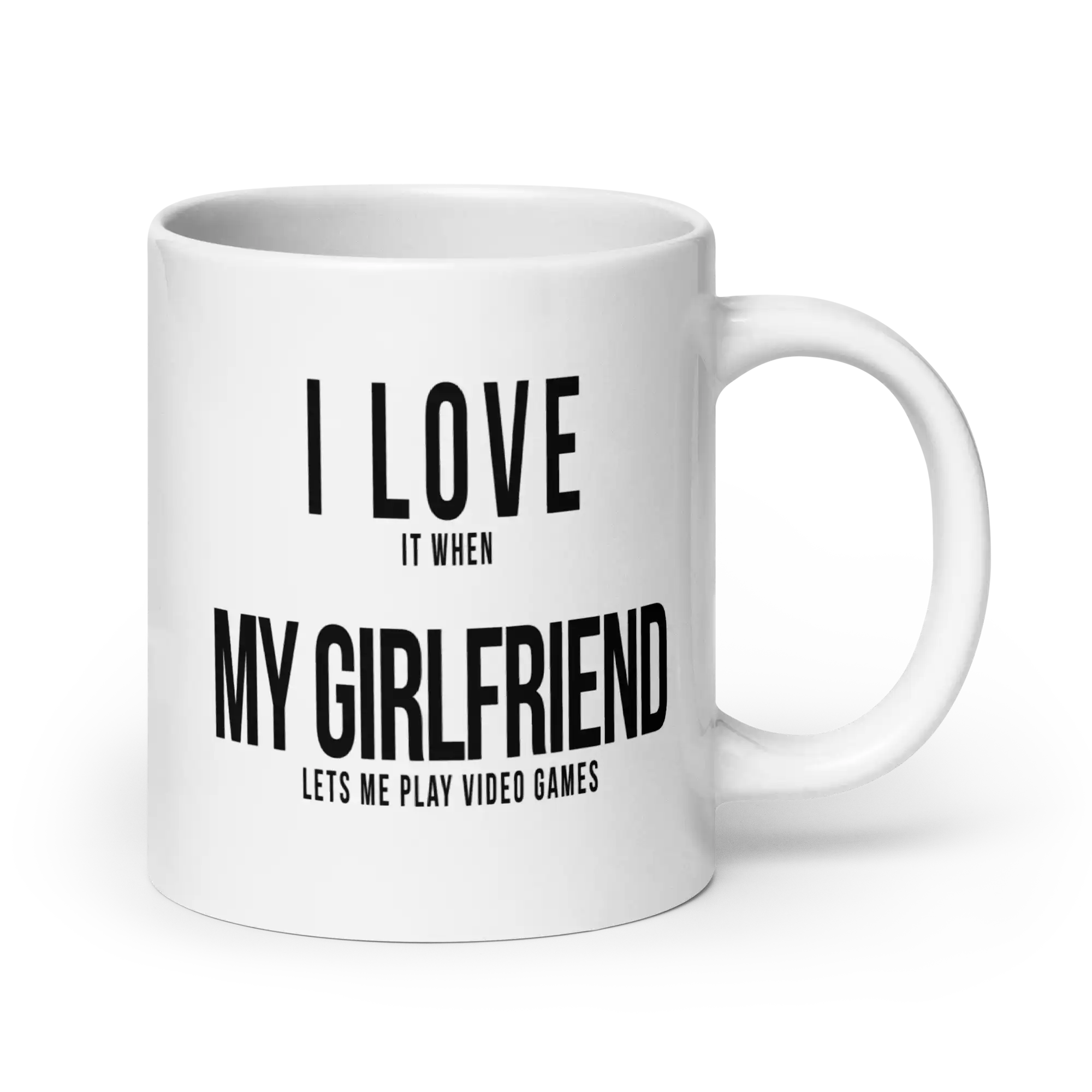 The ceramic version of the I love it when my girlfriend lets me play video games coffee mug is sturdy, glossy, and ready for everyday use.