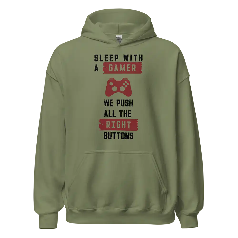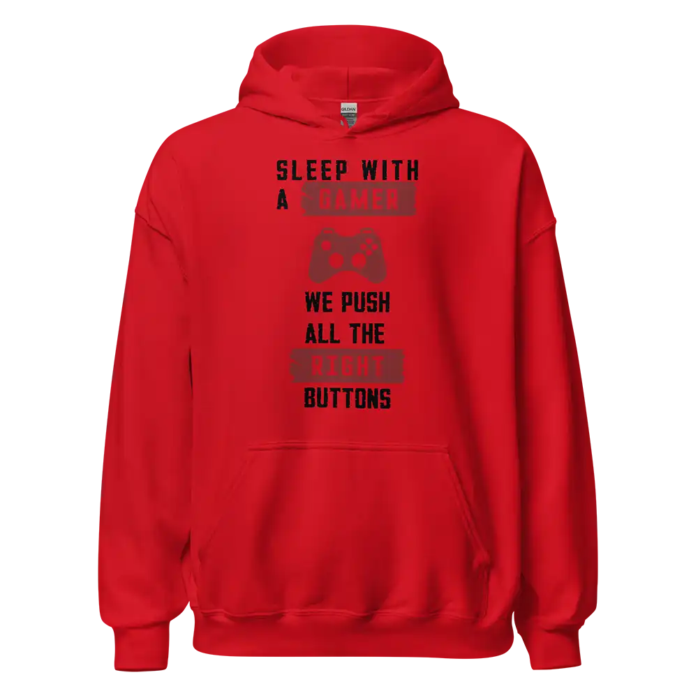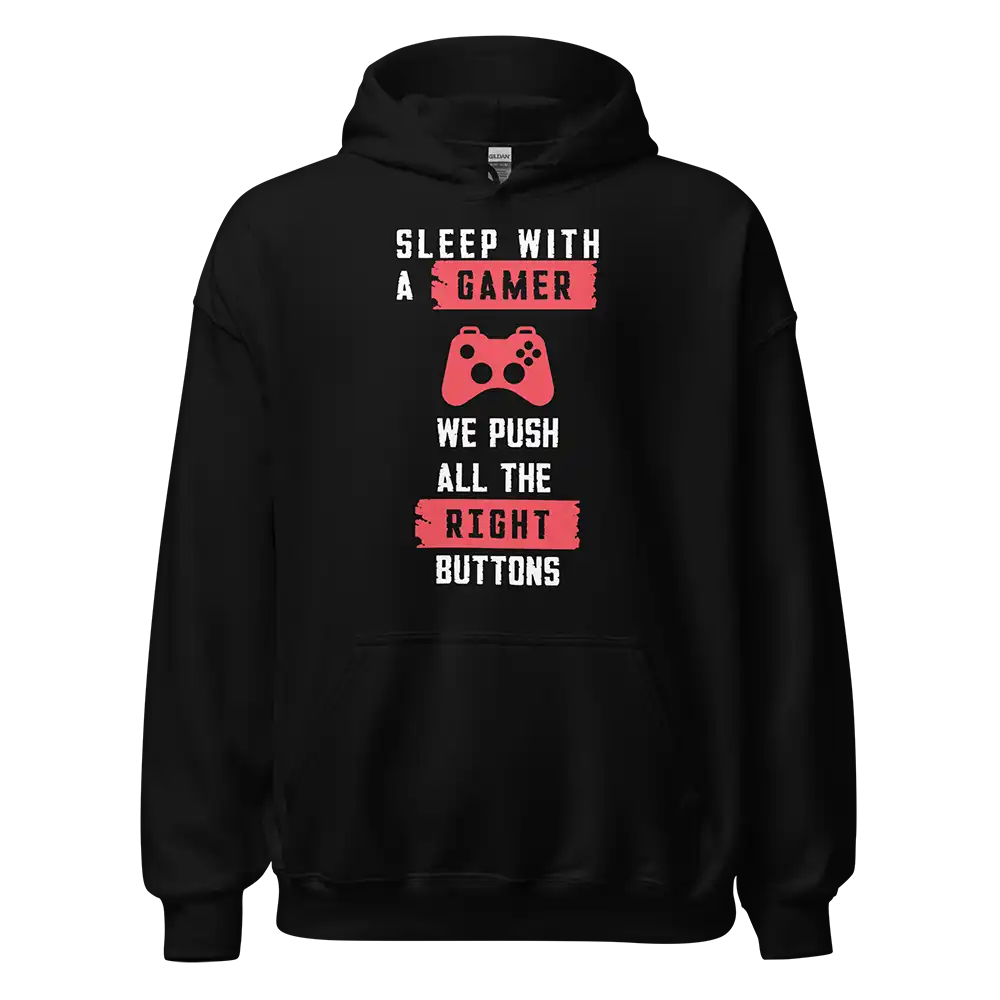 The Sleep with a Gamer We Push All the Right Buttons Hoodie combines playful gamer humor with quality materials designed for comfort and durability.